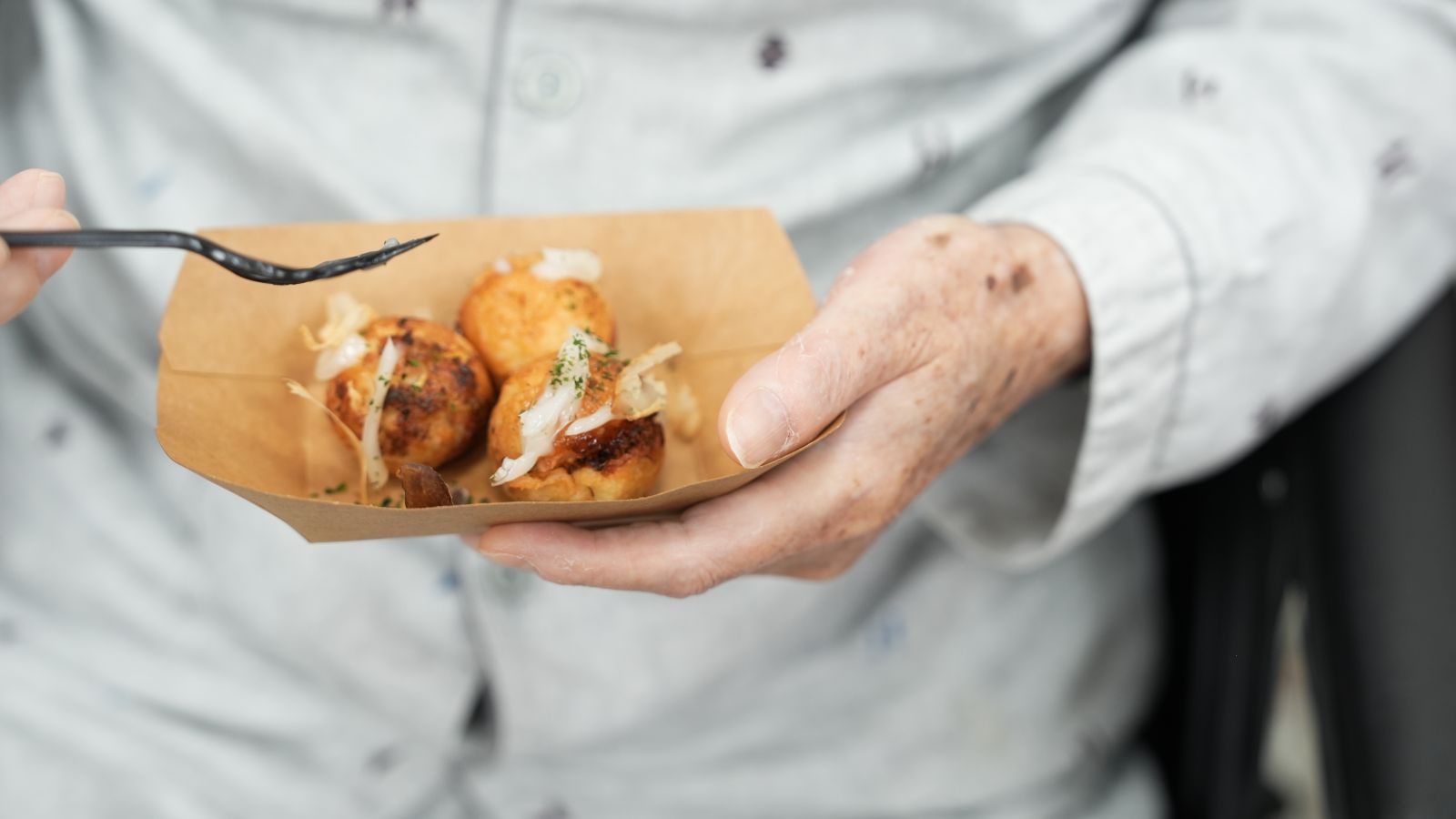 這次野餐日的特別之處,在於所有餐點都不是外叫,而是由保康長照中心營養師精心規劃專為長輩設計、再由保康長照工作人員親手製作。菜單包含了長輩們最愛的點心:鮪魚燒、紅豆餅、鯛魚燒,當美味的點心給予長輩時,長輩們露出驚喜的笑容,有的開心和身旁的朋友分享,有的細細品嚐那份久違的「新鮮感」。這樣的氛圍,就像一家人坐在草地上野餐,不僅享受美食,更在互動中感受不同的溫暖。
