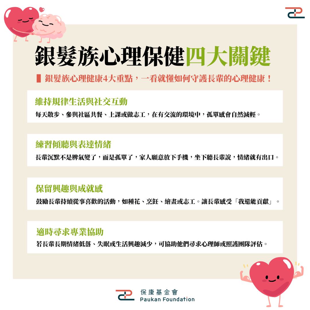 心理健康並不是「撐得住」就沒問題,而是能自在地表達情緒、與人互動、感受到被理解與被需要。當我們願意傾聽長輩的心聲、陪他們走出家門,那不只是關心,更是一種心理的照顧。