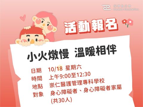長期照顧身心障礙者的家人,常在忙碌與壓力中忘了照顧自己。由黃薰緣諮商心理師帶領,讓照顧者學習放鬆、調整