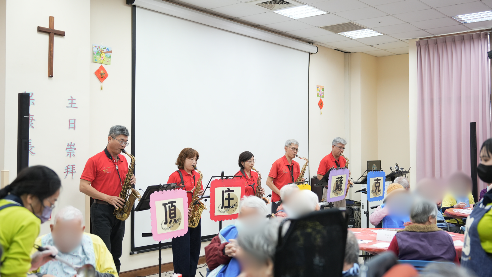 除了餐點,活動現場也安排了頂庄薩克斯風演奏。音樂在空間中緩緩流動,沒有喧鬧,卻讓整個長照中心多了一份溫度。有的長輩隨著旋律輕輕拍手,有的靜靜地聽著,專注在音樂裡。